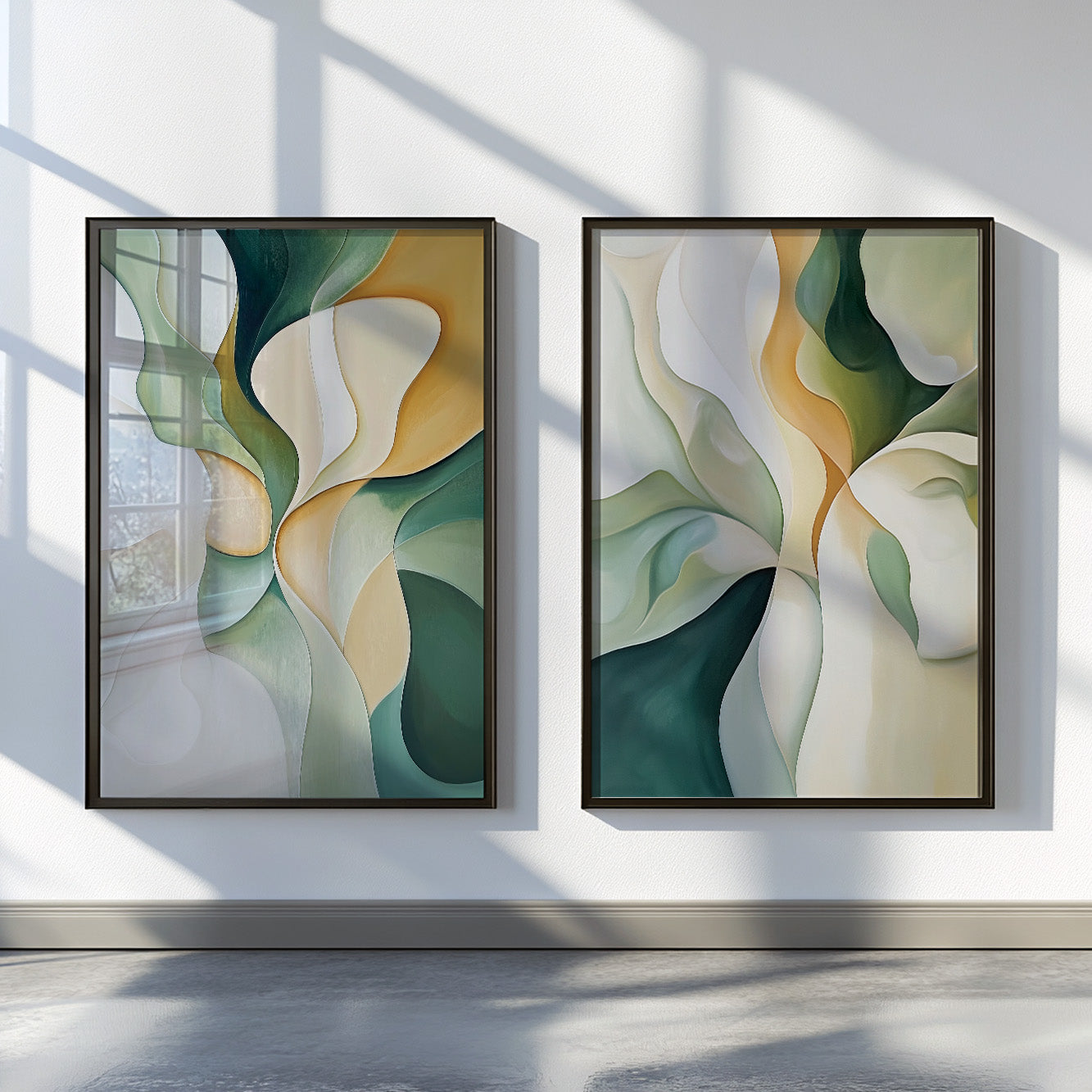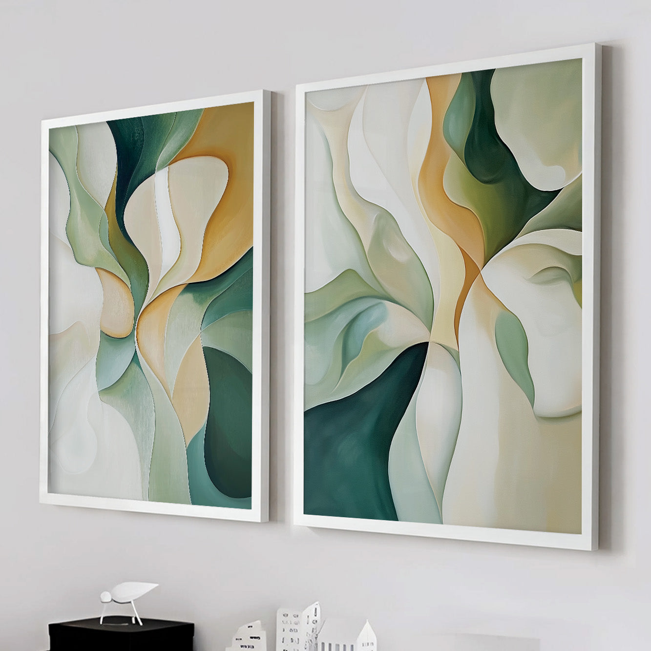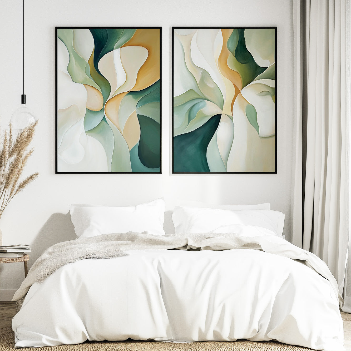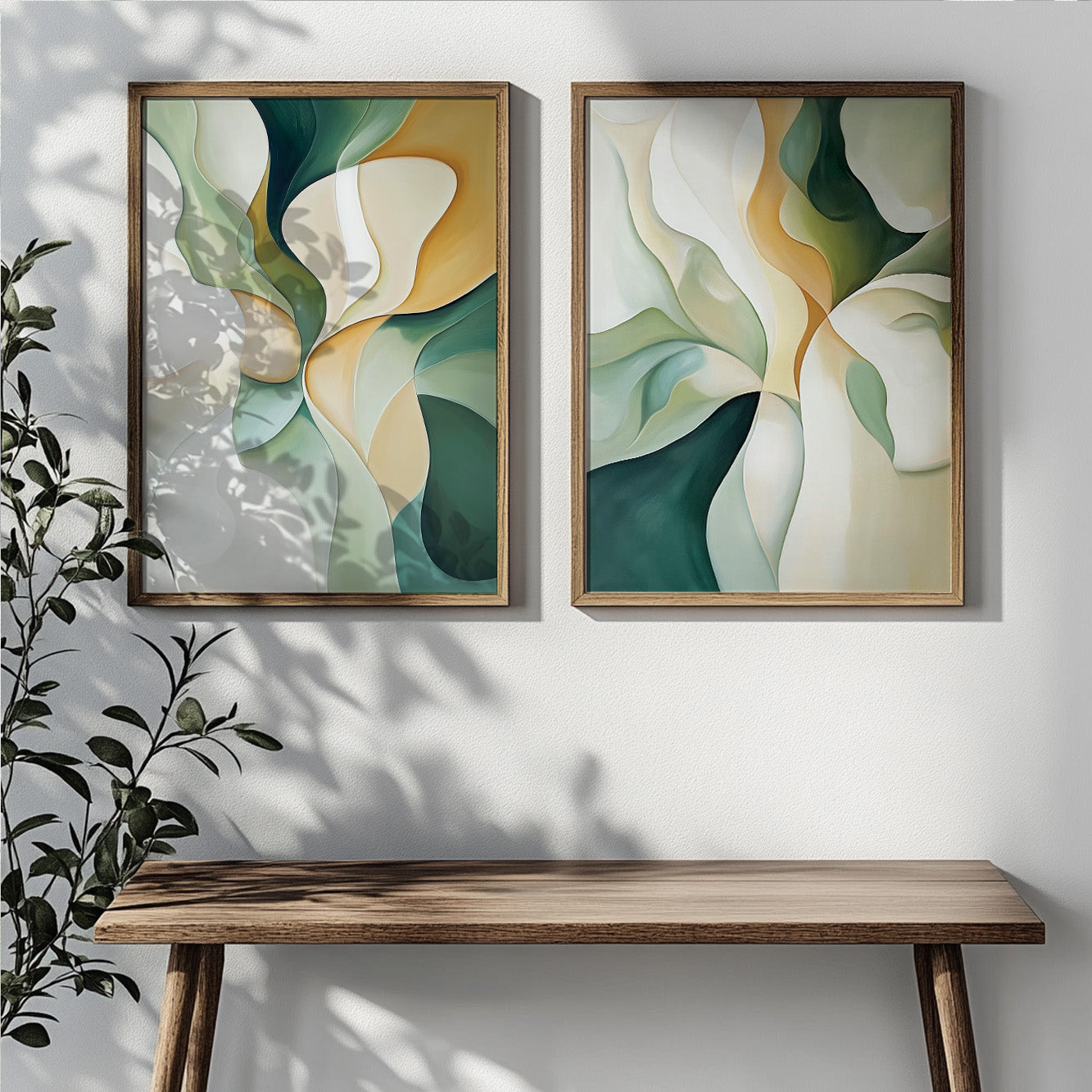 This emerald green and beige abstract wall art set of two pieces features modern shapes and bold brush strokes, blending earthy tones for a striking and sophisticated design. With a contemporary, minimalist style, these prints bring a dynamic yet calming atmosphere to any space. Perfect for adding a touch of nature-inspired elegance to your home, this set complements modern living room or bedroom decor beautifully.