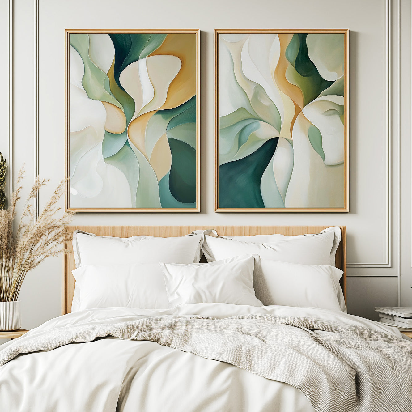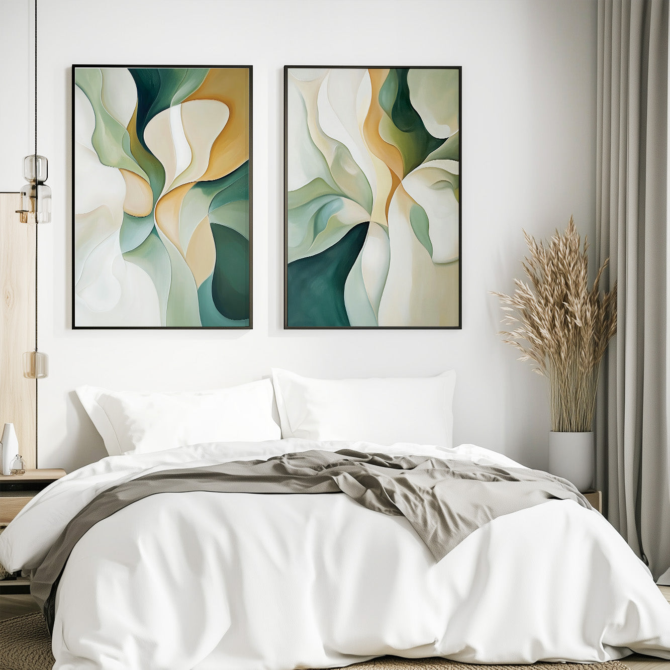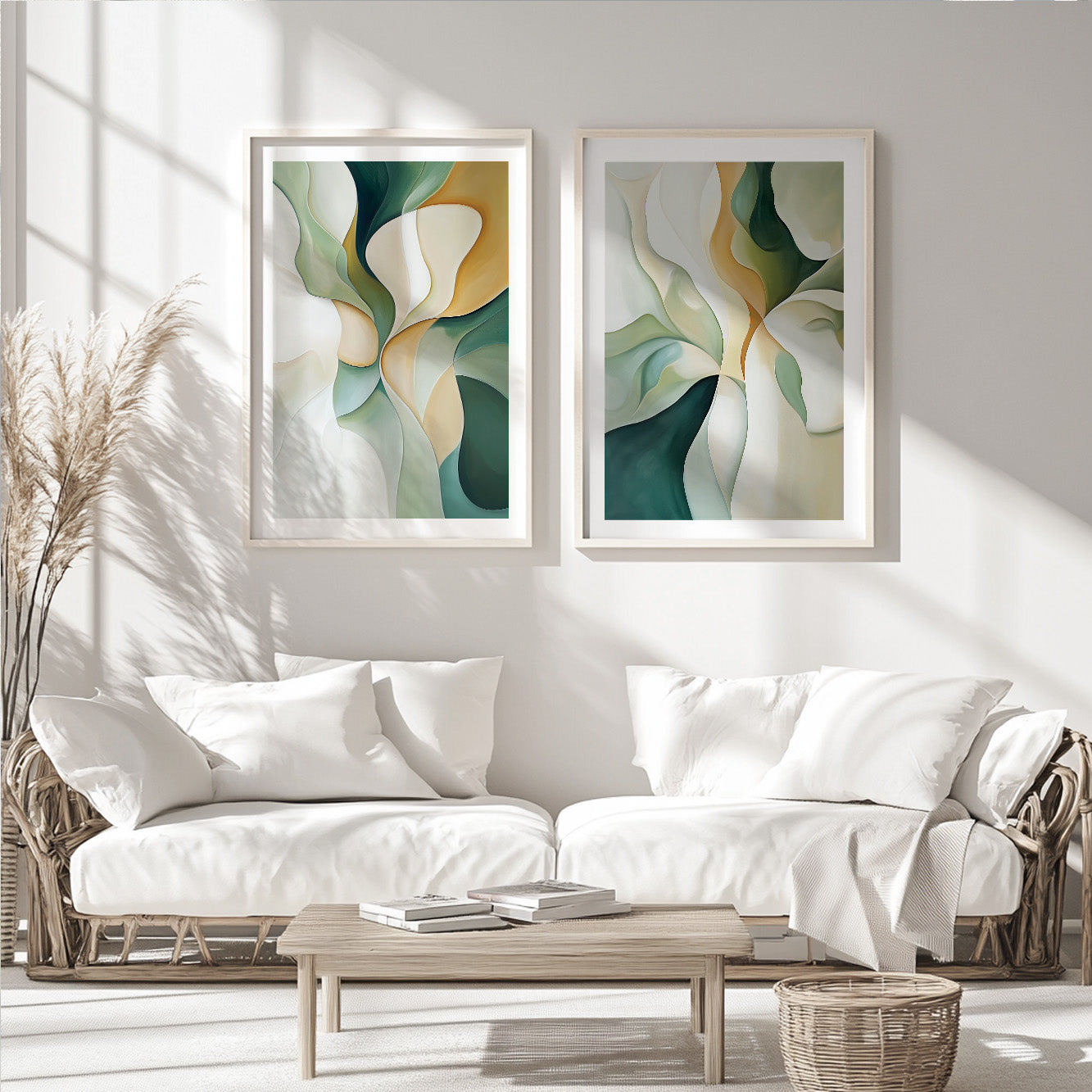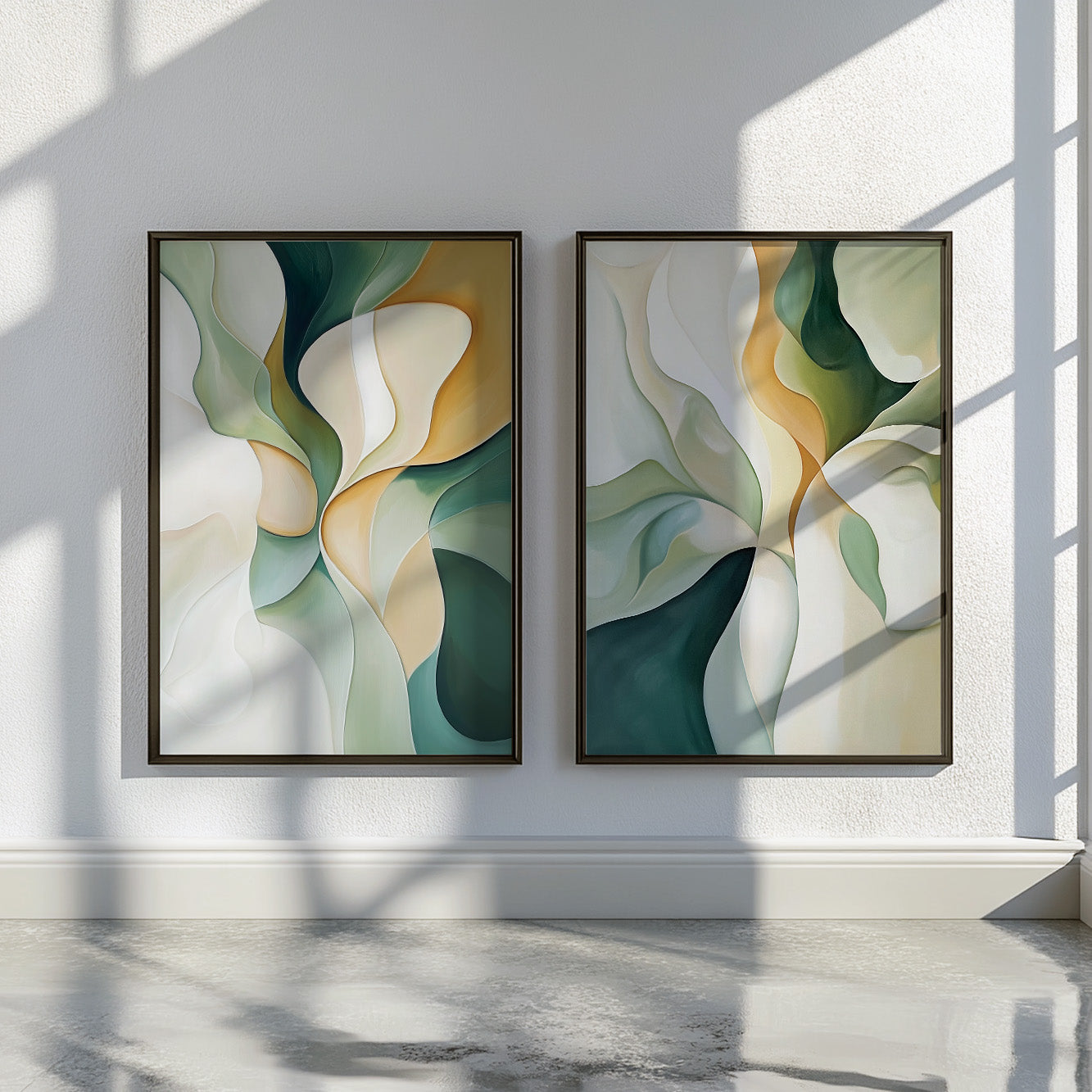 This emerald green and beige abstract wall art set of two pieces features modern shapes and bold brush strokes, blending earthy tones for a striking and sophisticated design. With a contemporary, minimalist style, these prints bring a dynamic yet calming atmosphere to any space. Perfect for adding a touch of nature-inspired elegance to your home, this set complements modern living room or bedroom decor beautifully.
