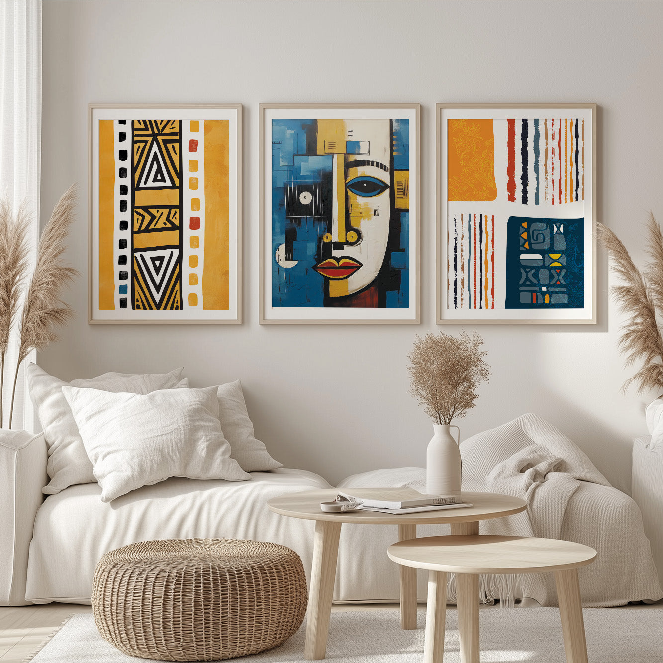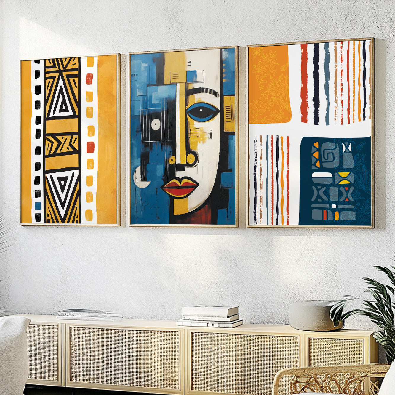 This set of three navy blue and yellow African American art prints showcases abstract designs inspired by African heritage and modern aesthetics. Bold contrasts, rich textures, and cultural symbolism create a striking visual statement, perfect for an ethnic gallery wall. Ideal for contemporary room decor, this set adds warmth, depth, and elegance to any space, making it a stunning focal point for your home or office.